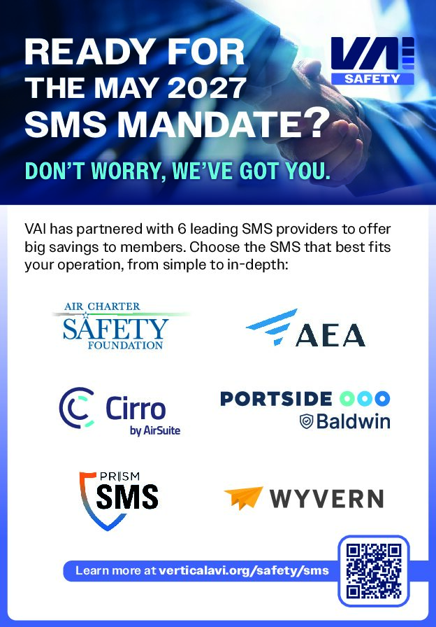 Home / Safety / Safety Management System (SMS) Software Solutions & Support / VAI SMS Workshop Resource Hub VAI SMS Workshop Resource Hub The critical resources you need to implement, mature, or sustain an effective safety management system. Overview The VAI Safety Industry Advisory Council (IAC) developed these resources for the VERTICON 2026 SMS Workshop. The guides reflect the actionable tips and tactics the Safety IAC members and other industry experts leading the workshop shared to support operators throughout the SMS lifecycle, whether you’re at the point of implementation, maturation, or sustaining your program. SMS Workstations The nine SMS workstation topics presented during the VERTICON 2026 SMS Workshop are listed here with links to their downloadable guides. Select the topics you wish to review to help focus and guide your SMS efforts. A comprehensive guide that includes all focus areas can be downloaded here: SMS Workshop Guide. 1. Safety Policy & Leadership | Guide Focus: Leadership commitment, safety accountabilities, roles, and governance. 2. Safety Documentation | Guide | Additional Resources Focus: Right-sized documentation that supports operations rather than burdens them. 3. Emergency Response Plan | Guide | Additional Resources Focus: Practical, executable emergency response planning. 4. Safety Risk Management | Guide Focus: Identifying hazards, assessing risk, and selecting effective controls. 5. Safety Assurance | Guide | Additional Resources Focus: Monitoring performance and ensuring SMS effectiveness over time. 6. Safety Promotion | Guide | Additional Resources Focus: Training, communication, and reinforcement of safety expectations. 7. Safety Culture/Just Culture | Guide Focus: Building trust, encouraging reporting, and responding consistently to behavior. 8. Civil Aviation Authority Resources (FAA, EASA, CASA, etc.) | Guide | Additional Resources Focus: Understanding regulatory expectations and demonstrating SMS compliance & maturity. 9. SMS Resources/Technology | Guide | Additional Resources Focus: Tools and technologies that support SMS without adding unnecessary complexity. Need More SMS Implementation and Compliance Support? Does all this information still seem a bit overwhelming? We got you! You can connect with a host of experts who do this for a living and can help you set your course to a fully operational and effective SMS implementation and regulatory compliance. Learn more at VAI’s SMS Software and Solutions and Support page or click on any of the links below for more information about each of our SMS partners and how they can tailor their support to meet your needs. Air Charter Safety Foundation (ACSF) Aircraft Electronics Association (AEA) Baldwin Safety & Compliance | Brochure CIRRO by AirSuite | Brochure PRISM SMS | Brochure WYVERN Ltd. | Brochure Note: During the workshop, our partner providers supported attendees by answering questions and sharing practical insights. The resource links provided here are not intended to promote specific products or services. Operators are encouraged to evaluate solutions independently and select the tools and providers that best fit your operational needs. Ready for More SMS Resources? The resources provided above are intended to get you started without overwhelming you—but they only scratch the surface. If your SMS program is mature and you’re ready to dive in deeper, check out these aviation safety websites to locate just about anything related to SMS or safety management in general. The Vertical Aviation Safety Team (VAST) Safety Library has dozens of additional SMS resources SKYbrary’s Safety Management section offers 170+ articles on the topic.